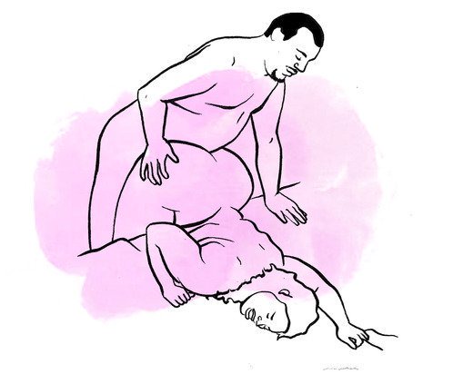👧Lay on your back with your hips just over the edge of the bed. He can stand & go straight into🍆 you while he either holds your legs or you rest them on his shoulders😉. His belly will be completely out of the way, plus he won't need to hold himself up